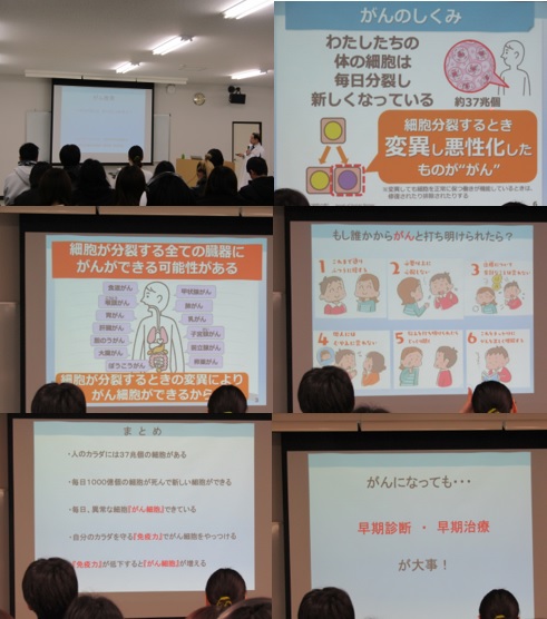 12月12日(木)、定時制では岸和田徳洲会病院の副院長先生を講師としてお招きし、がん教育LHRを実施しました。講義を受けて生徒達は、「早期発見、早期治療」、「正しい生活習慣、免疫力を上げる!」、「それでもやっぱり怖い病気だな…」など、様々な感想を寄せてくれました。規則正しい生活、定期的な病院での検診などを心掛けるとともに、『がんについての正しい知識とがん患者等に対する理解を深める。』ことができたなら嬉しく思います。