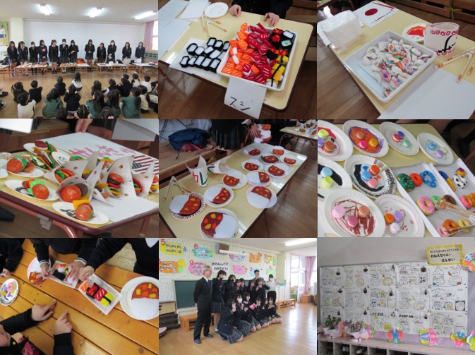 デザインシステム科では3年になると、様々なテーマごとに班に分かれて取り組む授業があります。『ものづく交流プロジェクト』チームでは、ものづくりを通して岸和田市立の幼稚園との交流を行っています。今年は12月16日(月)に園児さん達と『お店屋さん』を行いました。各国を代表する食べ物を「食品サンプル」の様にリアルに作った食品を模擬硬貨(これも手作りです)を使って販売しました。園児さんの「いらっしゃいませ!!」という元気一杯の大きな声が部屋中に響き渡り、本校の生徒達も優しい笑顔で交流を楽しみました。この交流を通して生徒達もたくさんの「学び」があったと思います。