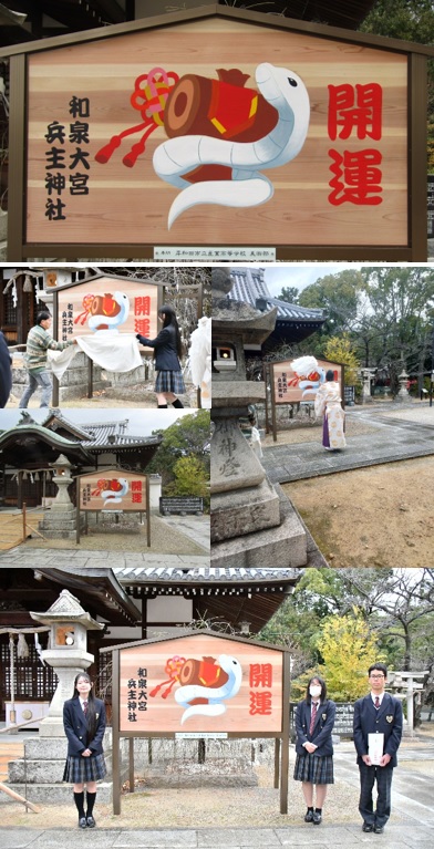 昨日、和泉大宮兵主神社様に大絵馬を奉納しました。平成28年以来、今回で10回目の奉納となります。大絵馬を制作した美術部部員のうち1年生3名が奉納式に参加し、境内に設置された来年の干支である巳(み)の大絵馬のお披露目をしました。 兵主神社にご参拝の皆さまには2025年も健康で過ごされることを願っています。来年も皆様にとって良い一年となりますように。