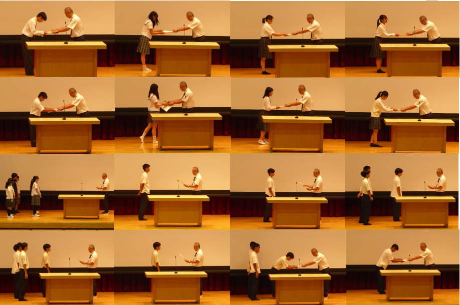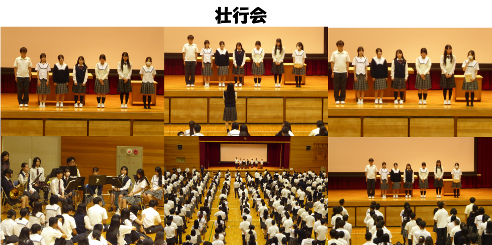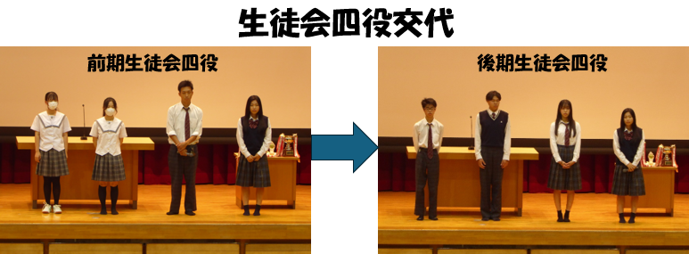 本日、生徒会四役交代および伝達表彰・壮行会を行いました。 前期生徒会四役の皆さん、生徒会企画や挨拶運動など大変だったと思いますが、お疲れ様でした。有難うございました。そして後期生徒会四役の皆さん、前期の皆さんとも連携しながら、よろしくお願いします。