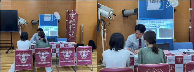 当日は参加11校のブースが設置され、個別対応で各校の説明をしました。本校も来場された中学生と保護者の方に本校の特色について説明をさせていただきました。