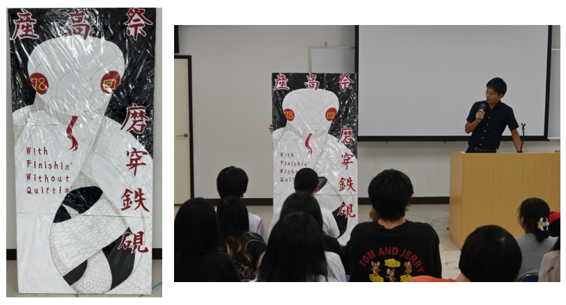 を行い、この夏、生徒会が作成してくれた『磨穿鉄硯(ませんてっけん)』をイメージした看板を紹介し、産高祭に向けての士気を高める話