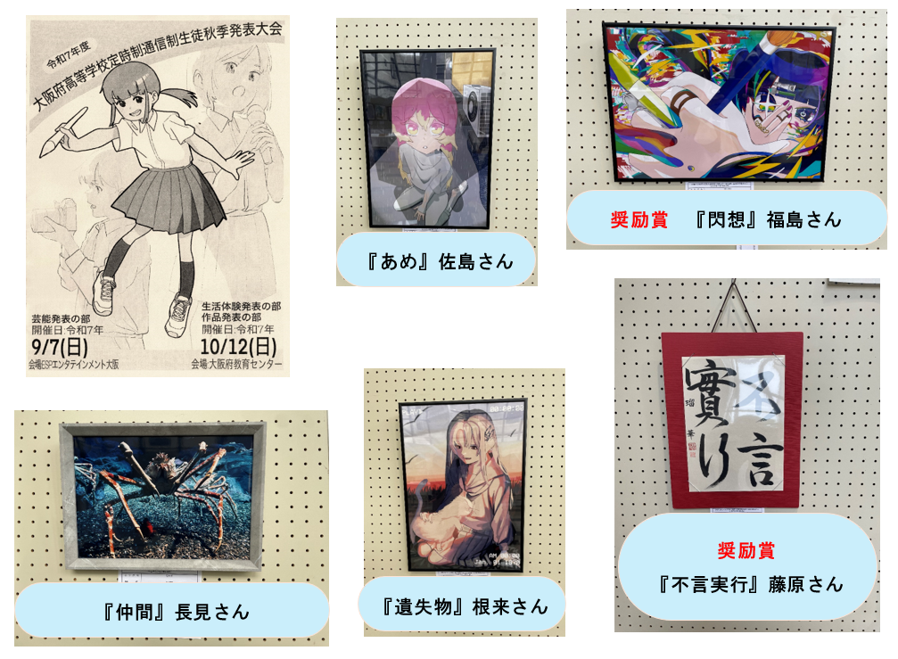 本校定時制からは作品発表の部として、絵画・書道・写真の部門で5名の生徒が出展し、『題名:閃想(せんそう)』という作品を描いた2年生の福島さんが見事『奨励賞』に選ばれました。