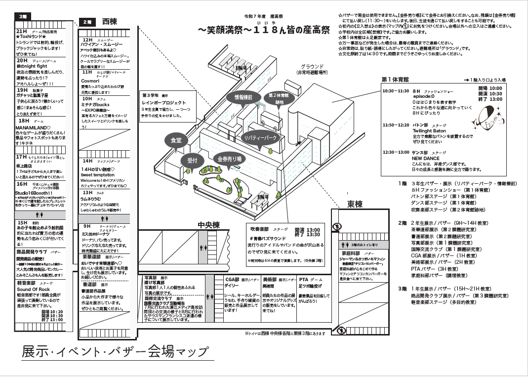 各クラス及び文化部の趣向を凝らした展示やイベント、ゲーム、バザーなど、楽しんでいただくことができたなら嬉しく思います。