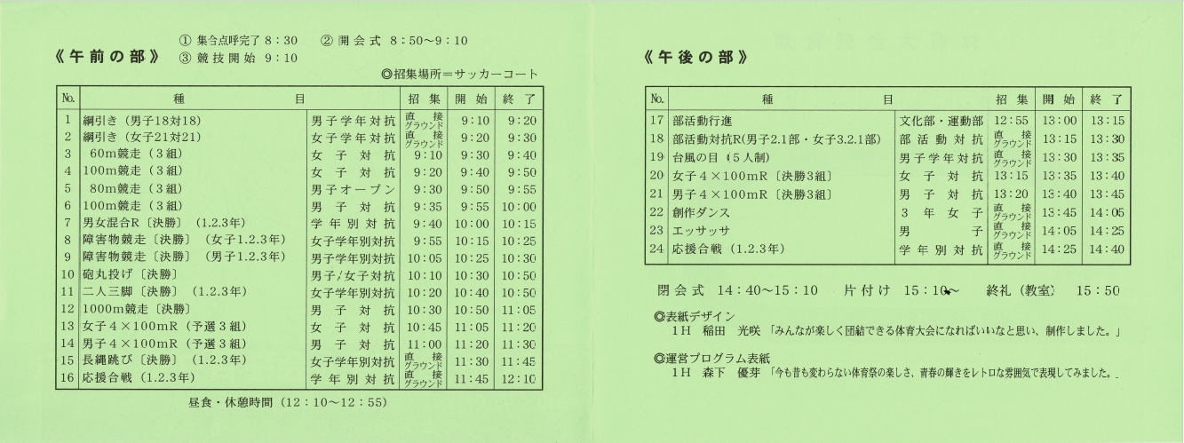 10月26日(日)に予定している体育大会のプログラムをお知らせします。午後からは部活動部員による行進および対抗リレー、台風の目、リレー種目の決勝、3年女子による創作ダンス、男子有志によるエッサッサ、最後に応援合戦を予定しています。