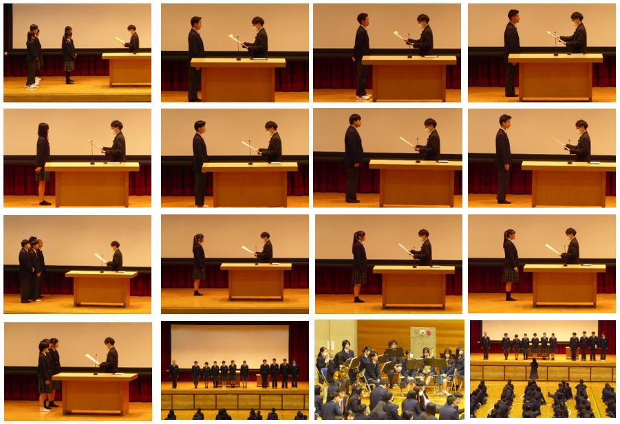 上記6つの部活動は『学校体育・文化の振興に寄与された功労』により表彰されたもので、代表として弓道部の生徒が登壇して岸和田市教育委員会教育長より表彰状を授与していただきました。