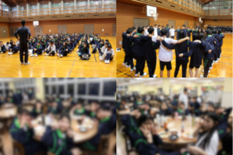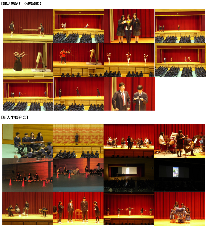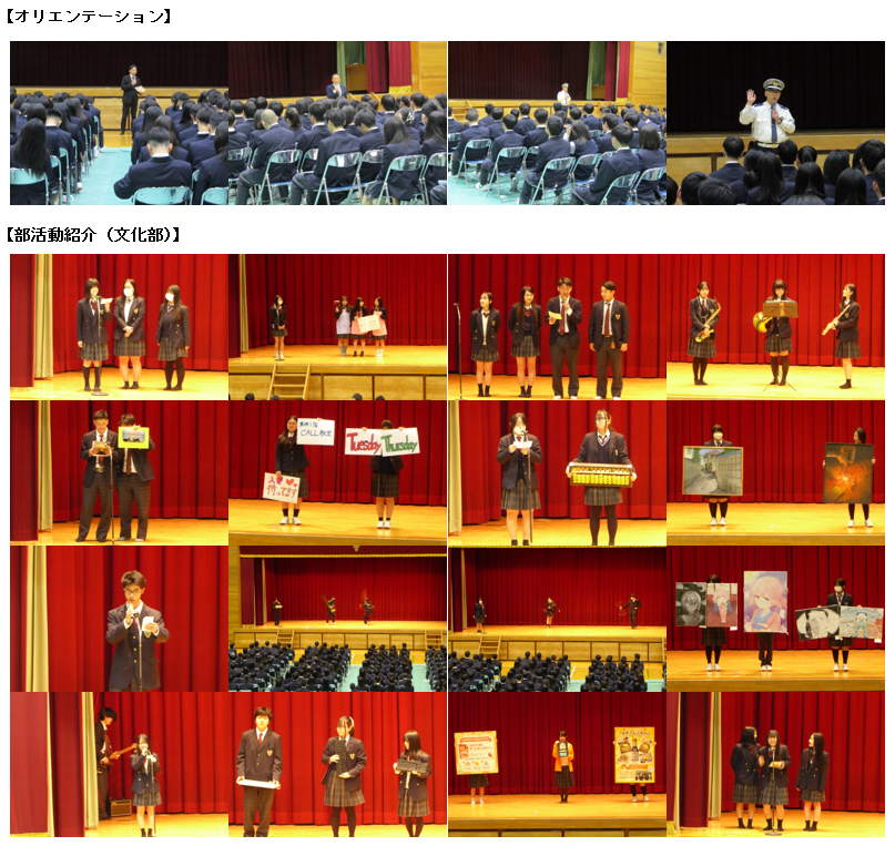 写真はオリエンテーションや部活動紹介、新入生歓迎会の舞台発表(吹奏楽部・軽音楽部・#コウホウブ・演劇部・バトン部)の様子です。新入生歓迎会は生徒会が中心となって運営しています。
