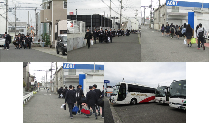今日は午前7:40に教室に集合しバスへ移動、クラスごとに7台のバスに乗り込み8:20頃、若狭に向けて出発しました。